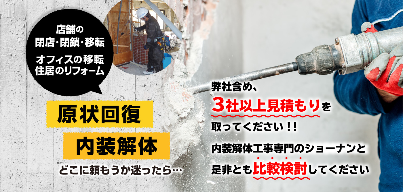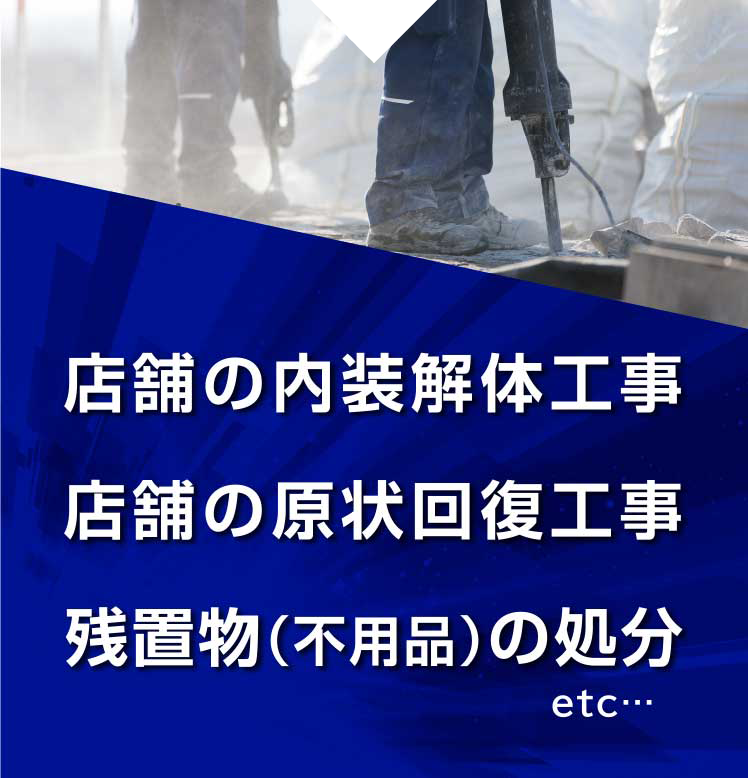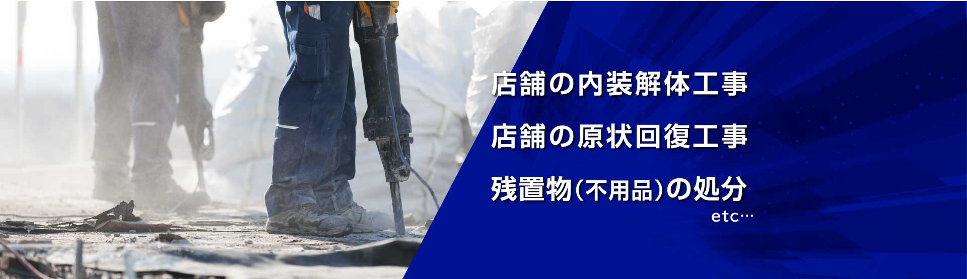 店舗の新装オープンやリニューアル、または、閉店や移転に伴う内装解体が大半です。住宅のリフォームなどによる「部分内装解体」も行います。